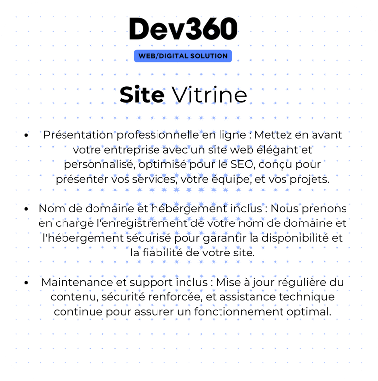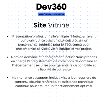 Offre Site Vitrine : Nous concevons des sites vitrines élégants et personnalisés pour présenter votre entreprise, vos services et vos projets de manière professionnelle. L'offre inclut l'enregistrement du nom de domaine, l'hébergement sécurisé, ainsi qu'une optimisation SEO pour améliorer votre visibilité sur les moteurs de recherche. La maintenance continue est également assurée pour garantir un site toujours à jour et performant.