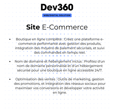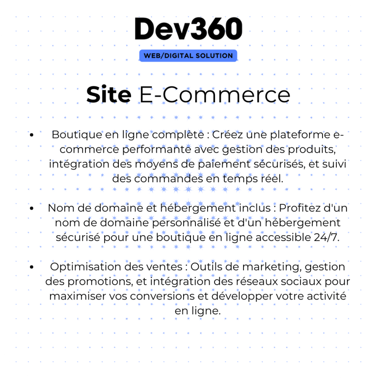 Offre Site E-commerce : Pour ceux qui souhaitent vendre en ligne, nous créons des boutiques e-commerce performantes avec gestion des produits, intégration des paiements sécurisés, et outils de marketing pour maximiser vos ventes. Le nom de domaine, l'hébergement sécurisé, ainsi que l'optimisation SEO sont inclus pour assurer le succès de votre boutique en ligne. Un support technique est également disponible pour vous accompagner en continu.