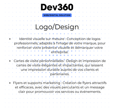 Offre Création de Logos et Design : Nous vous aidons à développer une identité visuelle forte avec des logos sur mesure, des cartes de visite élégantes, et des flyers attractifs pour promouvoir vos services. Chaque élément est conçu pour refléter fidèlement l'image de votre entreprise et laisser une impression durable.